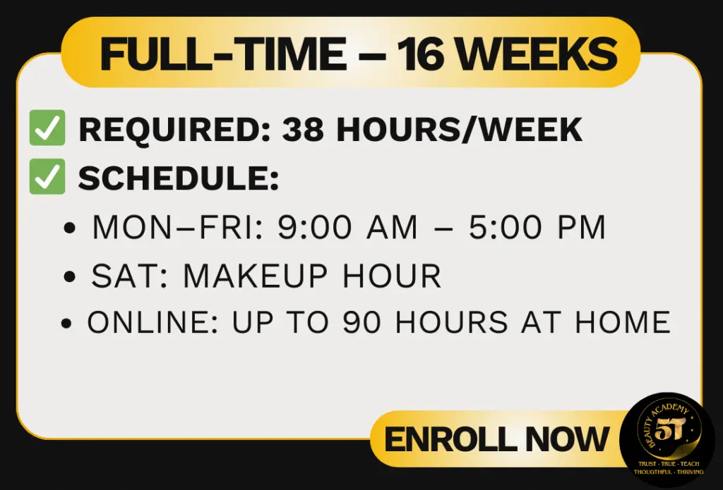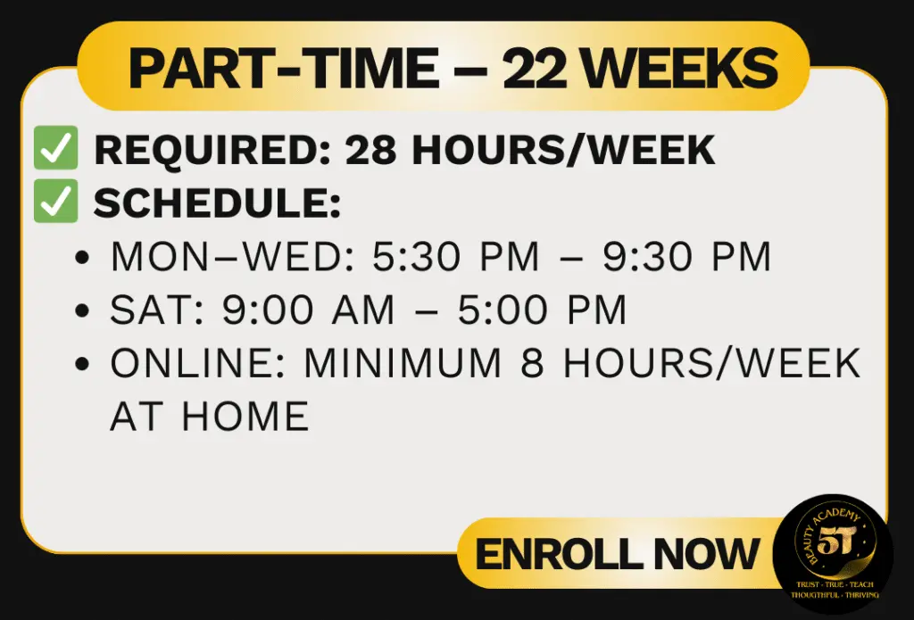At 5T Beauty Academy, we offer two professional programs designed to jumpstart your career in the beauty industry.
