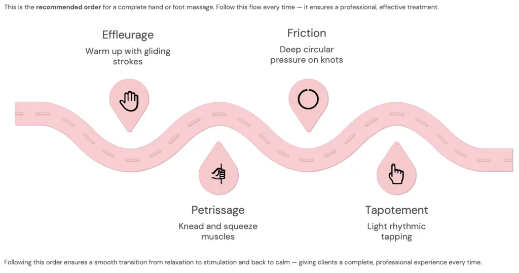 This is the recommended order for a complete hand or foot massage. Follow this flow every time — it ensures a professional, effective treatment.